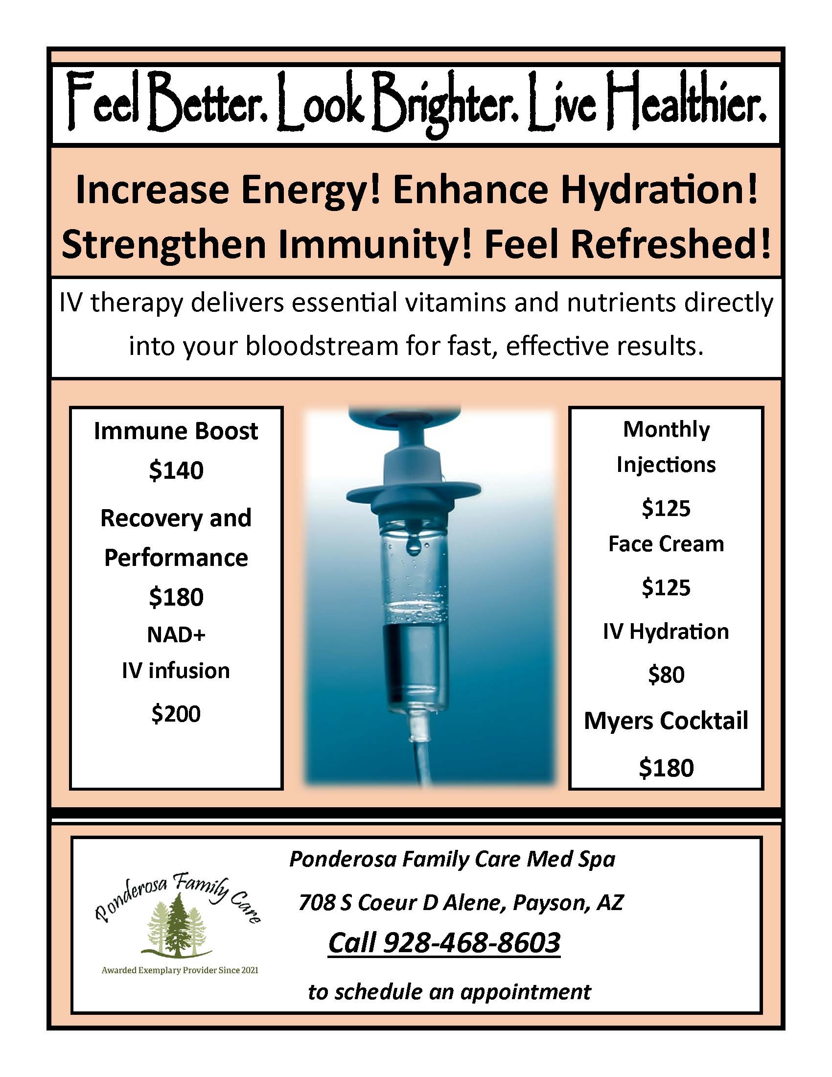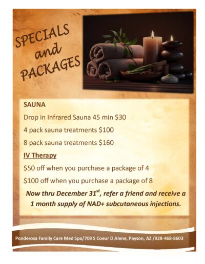 From IV THERAPY to INFRARED SAUNA THERAPY, we offer a variety of Med Spa Services. Click here to see a full list, plus prices.